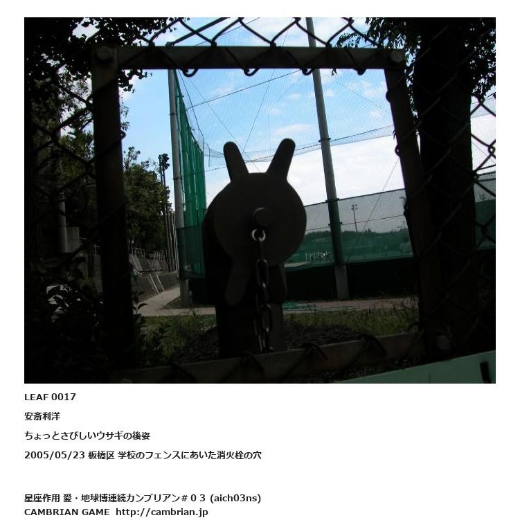 LEAF 0016フローに加えるLEAF 0017安斎利洋ちょっとさびしいウサギの後姿2005/05/23 板橋区 学校のフェンスにあいた消火栓の穴LEAF 0115フローに加えるLEAF 0039フローに加える
