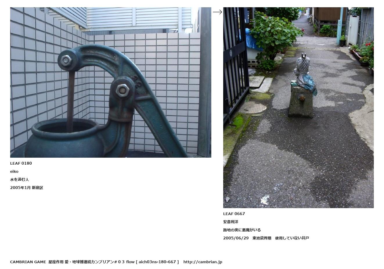 LEAF 0042フローに加えるLEAF 0180eiko水を汲む人2005年1月 新宿区↑ここから上をフローから外す↓ここから下をフローから外すLEAF 0667安斎利洋路地の奥に悪魔がいる2005/06/29 東池袋界隈 使用していない井戸