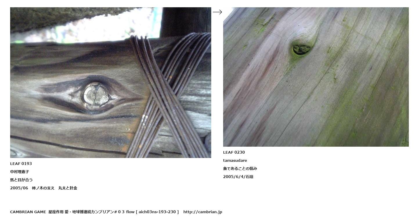 LEAF 0026フローに加えるLEAF 0193中村理恵子馬と目が合う2005/06 柿ノ木の支え 丸太と針金↑ここから上をフローから外す↓ここから下をフローから外すLEAF 0230tamasudare象であることの悩み2005/6/4/石垣LEAF 0406フローに加える