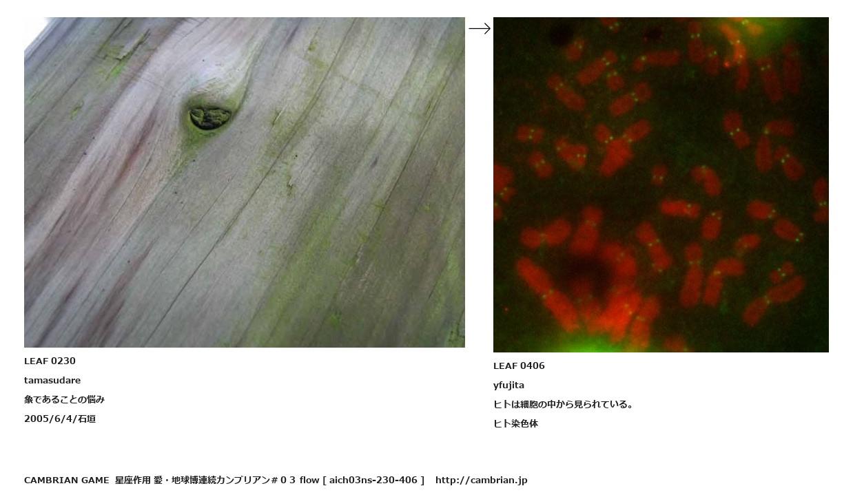 LEAF 0193フローに加えるLEAF 0230tamasudare象であることの悩み2005/6/4/石垣↑ここから上をフローから外す↓ここから下をフローから外すLEAF 0406yfujitaヒトは細胞の中から見られている。ヒト染色体LEAF 0620フローに加えるLEAF 0412フローに加える