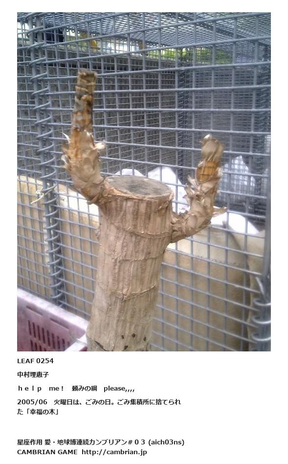 LEAF 0249フローに加えるLEAF 0254中村理恵子help me! 頼みの綱 please,,,,2005/06 火曜日は、ごみの日。ごみ集積所に捨てられた「幸福の木」LEAF 0278フローに加える
