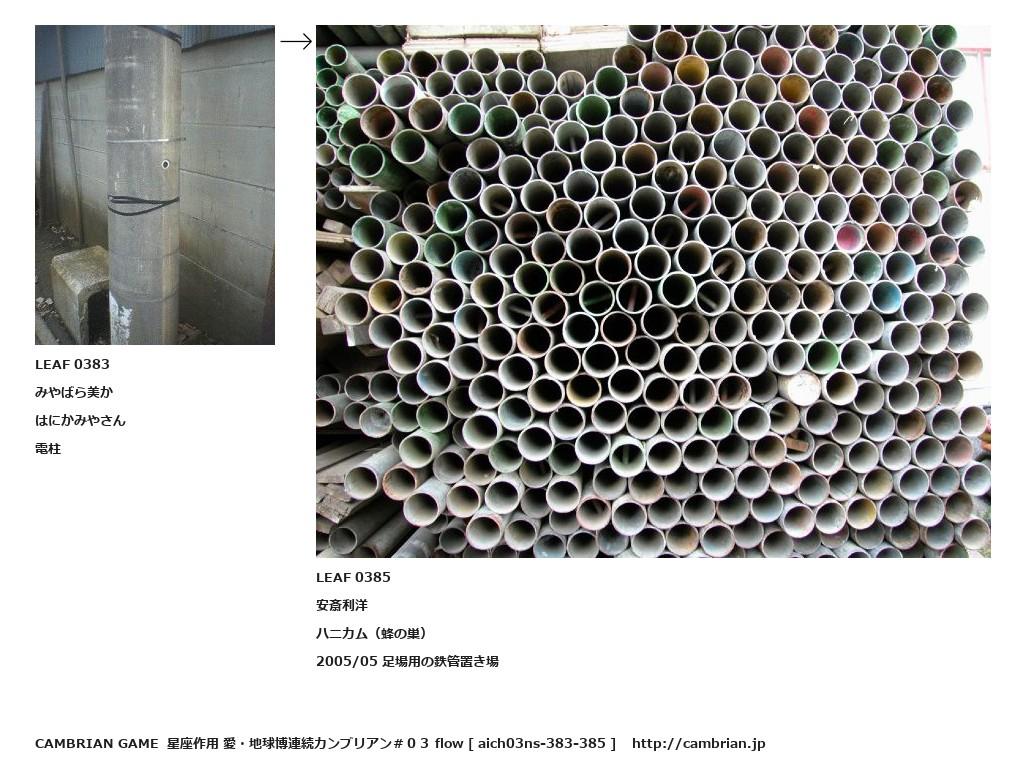 LEAF 0202フローに加えるLEAF 0383みやばら美かはにかみやさん電柱↑ここから上をフローから外す↓ここから下をフローから外すLEAF 0385安斎利洋ハニカム(蜂の巣)2005/05 足場用の鉄管置き場