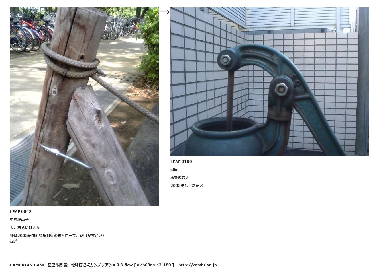 LEAF 0031フローに加えるLEAF 0042中村理恵子人、あるいは人々多摩2005駅前駐輪場付近の杭とロープ、鎹(かすがい)など↑ここから上をフローから外す↓ここから下をフローから外すLEAF 0180eiko水を汲む人2005年1月 新宿区LEAF 0667フローに加えるLEAF 0200フローに加える