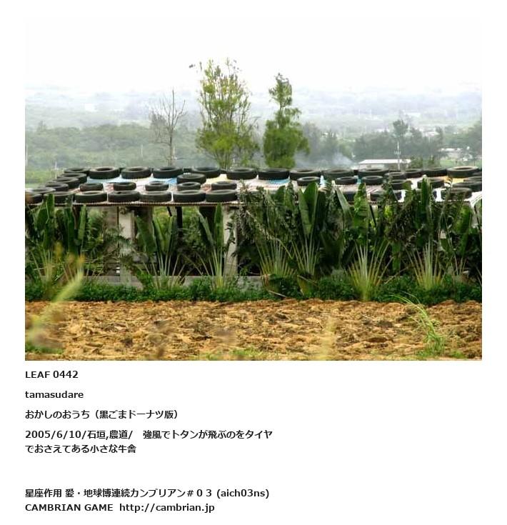 LEAF 0442tamasudareおかしのおうち(黒ごまドーナツ版)2005/6/10/石垣,農道/ 強風でトタンが飛ぶのをタイヤでおさえてある小さな牛舎