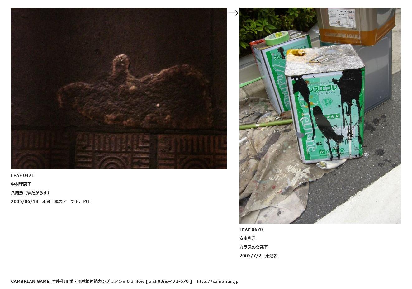LEAF 0468フローに加えるLEAF 0471中村理恵子八咫烏(やたがらす)2005/06/18 本郷 構内アーチ下、路上↑ここから上をフローから外す↓ここから下をフローから外すLEAF 0670安斎利洋カラスの会議室2005/7/2 東池袋