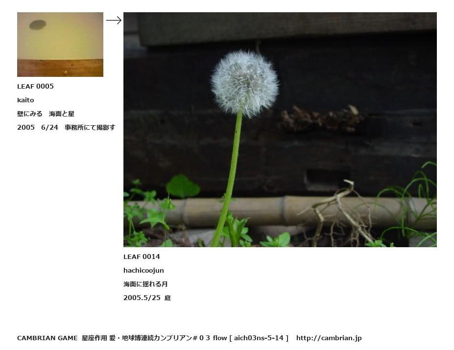 LEAF 0004フローに加えるLEAF 0005kaito壁にみる 海面と星2005 6/24 事務所にて撮影す↑ここから上をフローから外す↓ここから下をフローから外すLEAF 0014hachicoojun海面に揺れる月2005.5/25 庭LEAF 0032フローに加えるLEAF 0024フローに加える