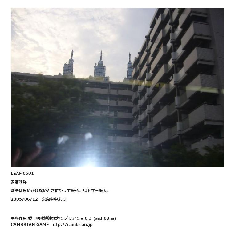 LEAF 0495フローに加えるLEAF 0501安斎利洋戦争は思いがけないときにやって来る。見下す三魔人。2005/06/12 京急車中よりLEAF 0913フローに加えるLEAF 0534フローに加えるLEAF 0517フローに加える