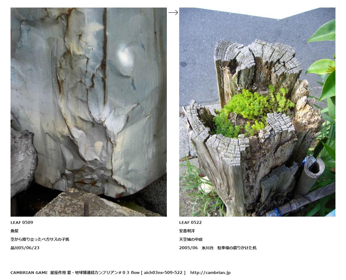 LEAF 0508フローに加えるLEAF 0509魚梨空から降り立ったペガサスの子馬品川05/06/23↑ここから上をフローから外す↓ここから下をフローから外すLEAF 0522安斎利洋天空城の中庭2005/06 氷川台 駐車場の腐りかけた杭