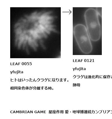LEAF 0054フローに加えるLEAF 0055yfujitaヒトはいったんクラゲになります。相同染色体が分離する時。↑ここから上をフローから外す↓ここから下をフローから外すLEAF 0121yfujitaクラゲは進化的に保存されている(仮説)酵母LEAF 0393フローに加えるLEAF 0214フローに加えるLEAF 0144フローに加えるLEAF 0131フローに加える