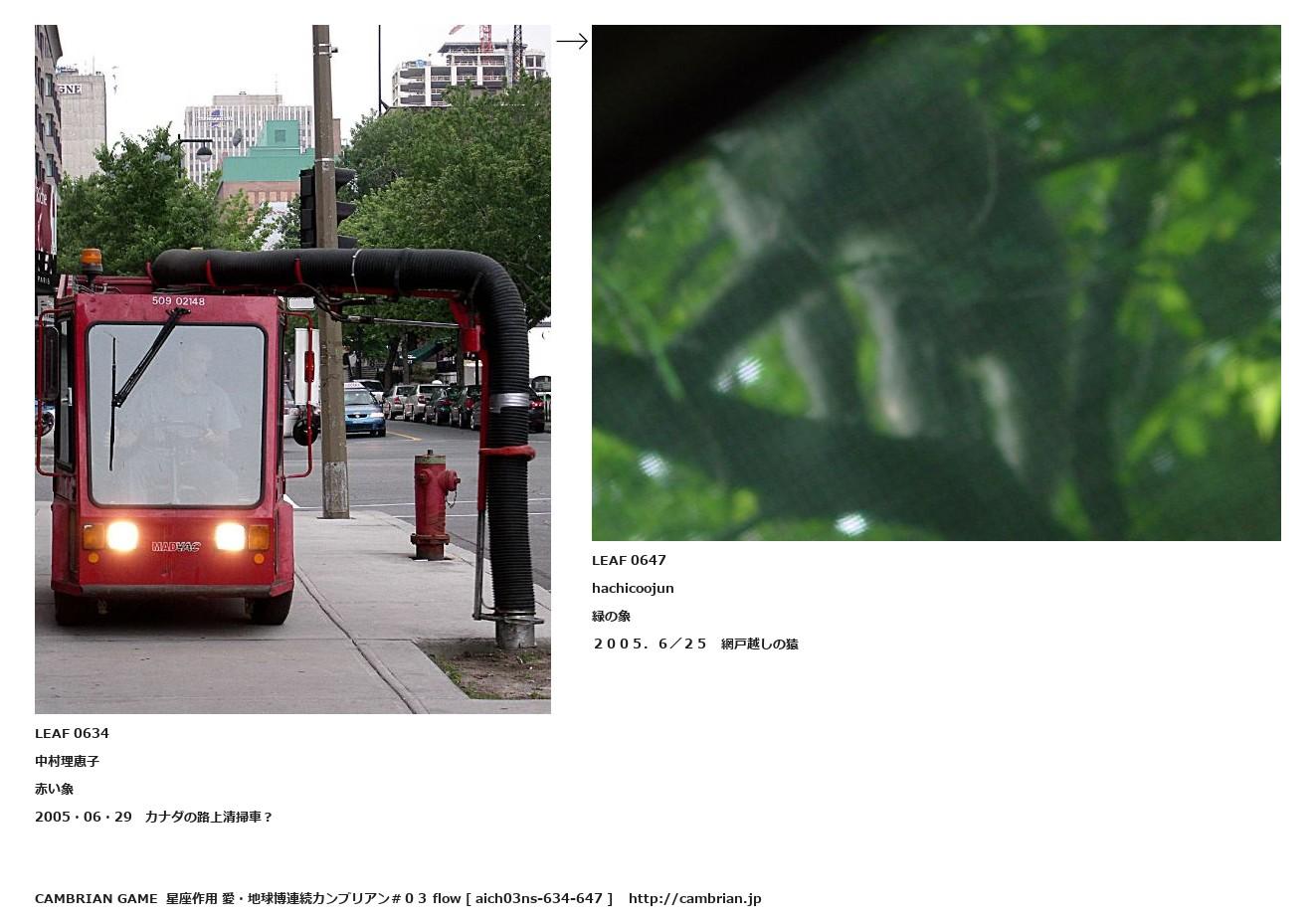 LEAF 0631フローに加えるLEAF 0634中村理恵子赤い象2005・06・29 カナダの路上清掃車?↑ここから上をフローから外す↓ここから下をフローから外すLEAF 0647hachicoojun緑の象2005.6/25 網戸越しの猿LEAF 0714フローに加える