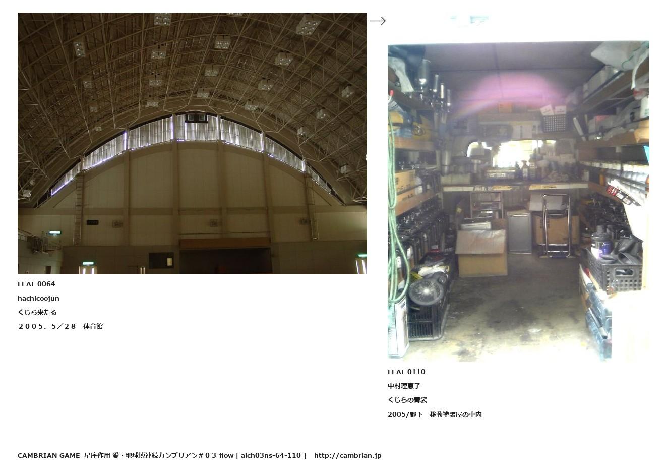 LEAF 0054フローに加えるLEAF 0064hachicoojunくじら来たる2005.5/28 体育館↑ここから上をフローから外す↓ここから下をフローから外すLEAF 0110中村理恵子くじらの胃袋2005/都下 移動塗装屋の車内