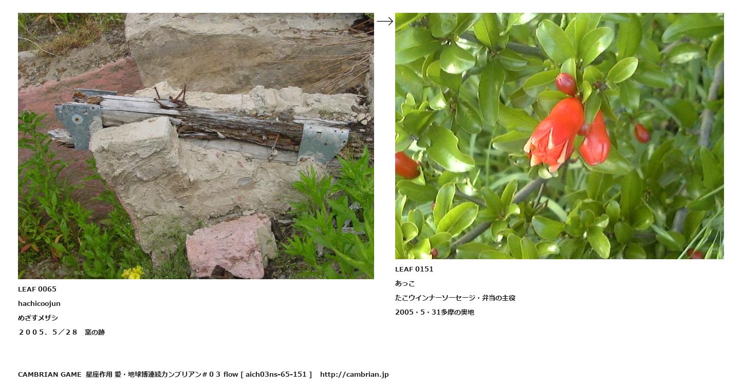 LEAF 0042フローに加えるLEAF 0065hachicoojunめざすメザシ2005.5/28 窯の跡↑ここから上をフローから外す↓ここから下をフローから外すLEAF 0151あっこたこウインナーソーセージ・弁当の主役2005・5・31多摩の奥地LEAF 0218フローに加える