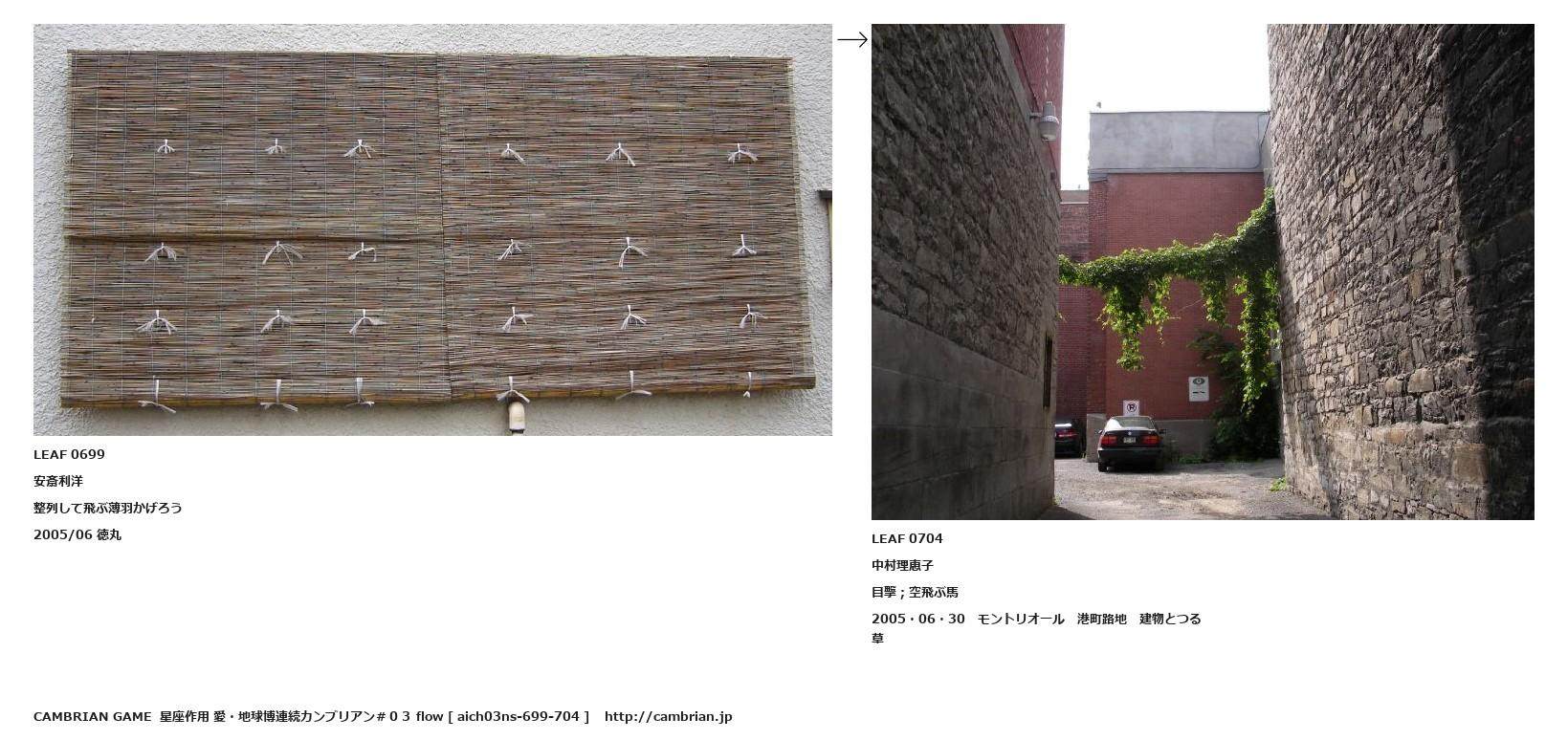 LEAF 0694フローに加えるLEAF 0699安斎利洋整列して飛ぶ薄羽かげろう2005/06 徳丸↑ここから上をフローから外す↓ここから下をフローから外すLEAF 0704中村理恵子目撃;空飛ぶ馬2005・06・30 モントリオール 港町路地 建物とつる草