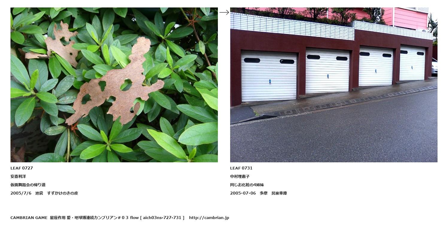 LEAF 0687フローに加えるLEAF 0727安斎利洋仮面舞踏会の帰り道2005/7/6 池袋 すずかけのきの皮↑ここから上をフローから外す↓ここから下をフローから外すLEAF 0731中村理恵子同じお化粧の4姉妹2005・07・06 多摩 民家車庫