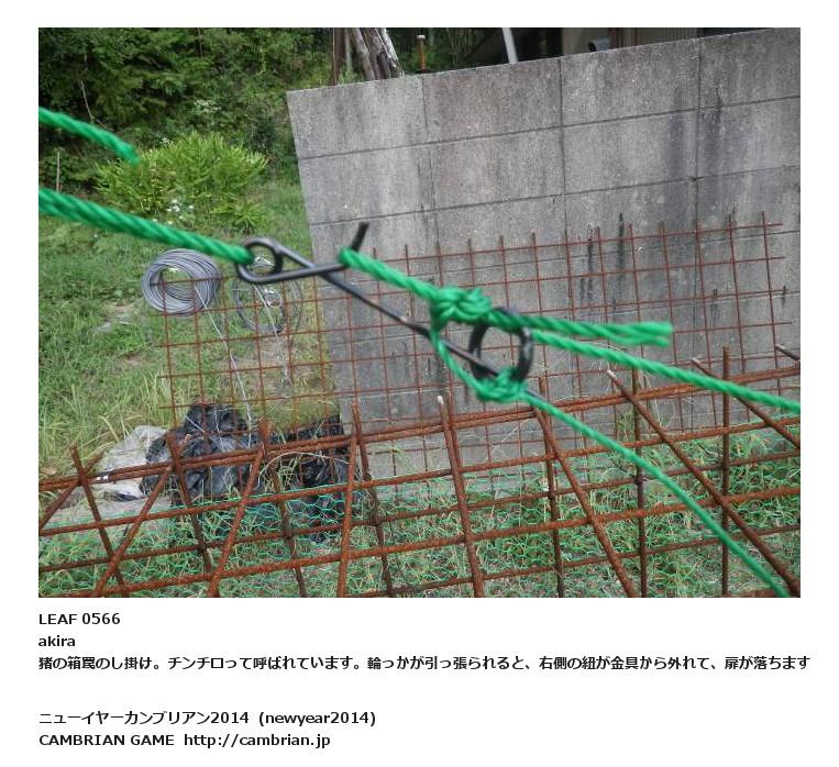 LEAF 0566akira猪の箱罠のし掛け。チンチロって呼ばれています。輪っかが引っ張られると、右側の紐が金具から外れて、扉が落ちます