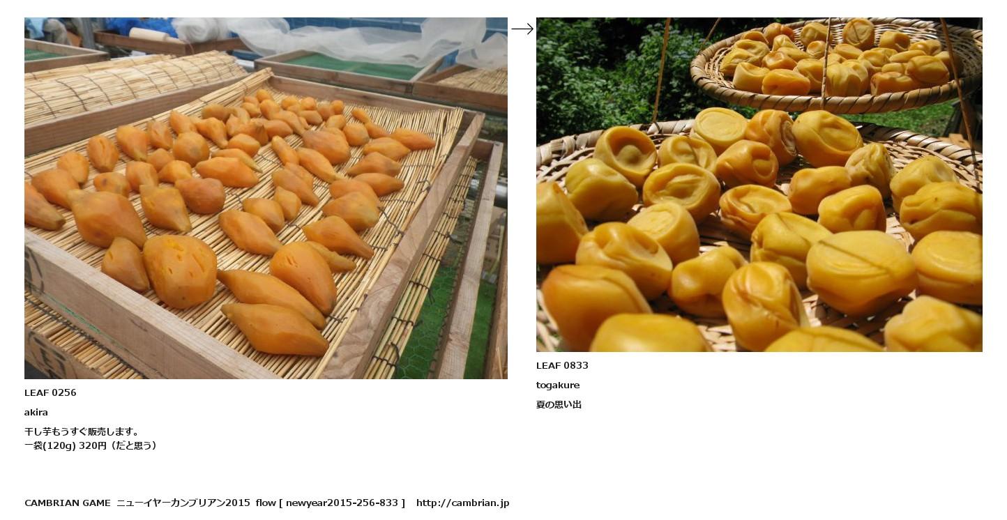 LEAF 0082フローに加えるLEAF 0256akira干し芋もうすぐ販売します。一袋(120g) 320円(だと思う)↑ここから上をフローから外す↓ここから下をフローから外すLEAF 0833togakure夏の思い出LEAF 0836フローに加える