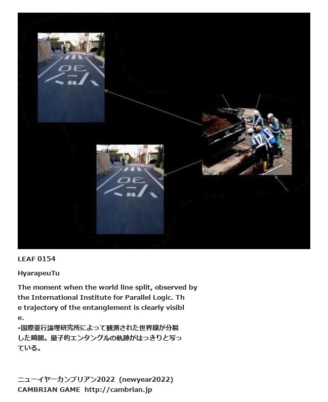 LEAF 0008フローに加えるLEAF 0154HyarapeuTuThe moment when the world line split, observed by the International Institute for Parallel Logic. The trajectory of the entanglement is clearly visible.-国際並行論理研究所によって観測された世界線が分裂した瞬間。量子的エンタングルの軌跡がはっきりと写っている。LEAF 0306フローに加える