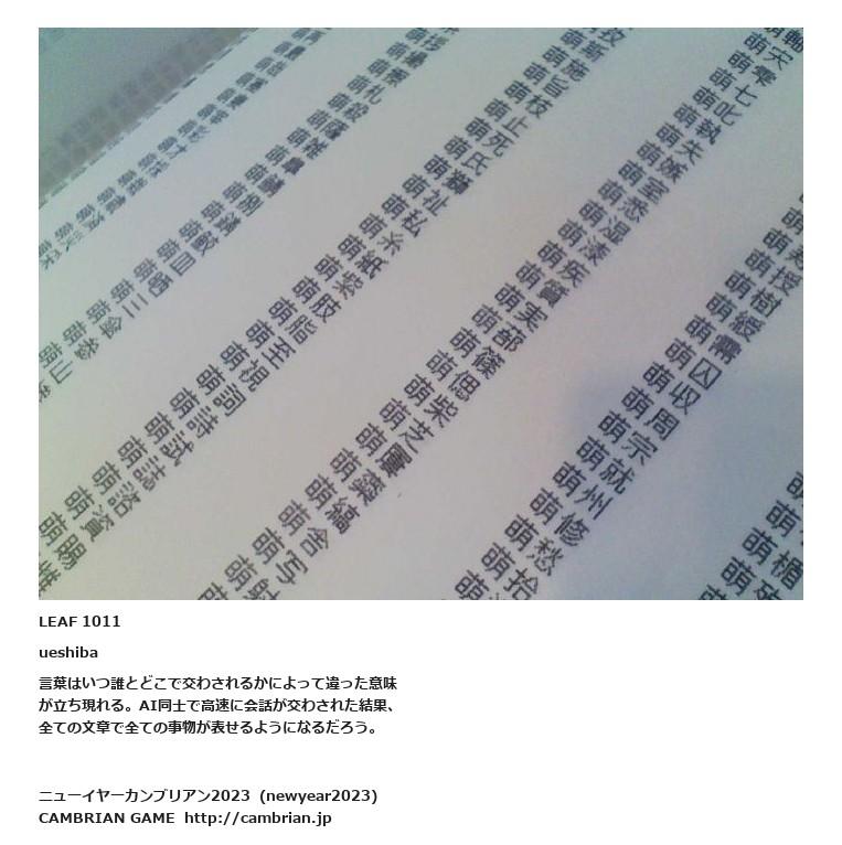LEAF 1009フローに加えるLEAF 1011ueshiba言葉はいつ誰とどこで交わされるかによって違った意味が立ち現れる。AI同士で高速に会話が交わされた結果、全ての文章で全ての事物が表せるようになるだろう。LEAF 1019フローに加えるLEAF 1013フローに加える
