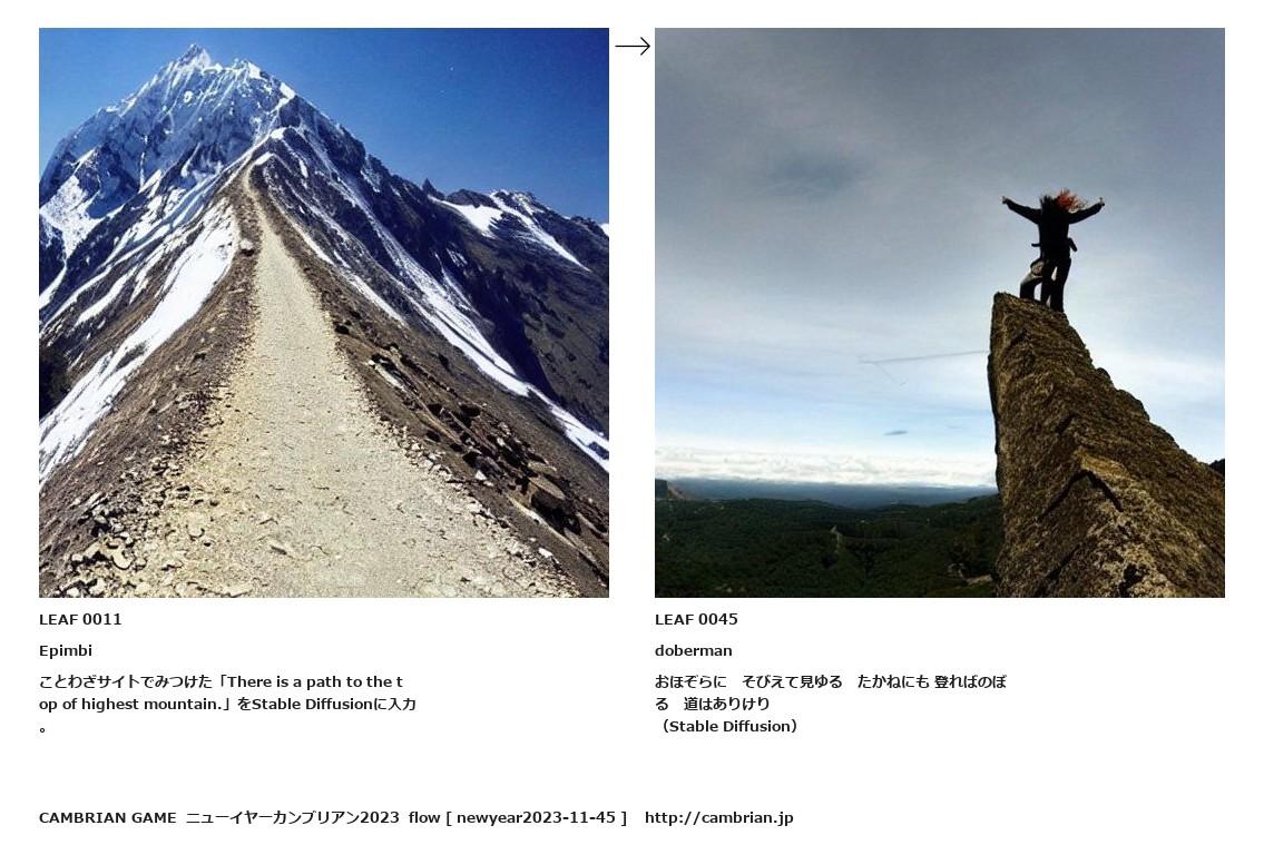 LEAF 0001フローに加えるLEAF 0011Epimbiことわざサイトでみつけた「There is a path to the top of highest mountain.」をStable Diffusionに入力。↑ここから上をフローから外す↓ここから下をフローから外すLEAF 0045dobermanおほぞらに そびえて見ゆる たかねにも 登ればのぼる 道はありけり(Stable Diffusion)LEAF 0370フローに加えるLEAF 0314フローに加えるLEAF 0196フローに加えるLEAF 0096フローに加える