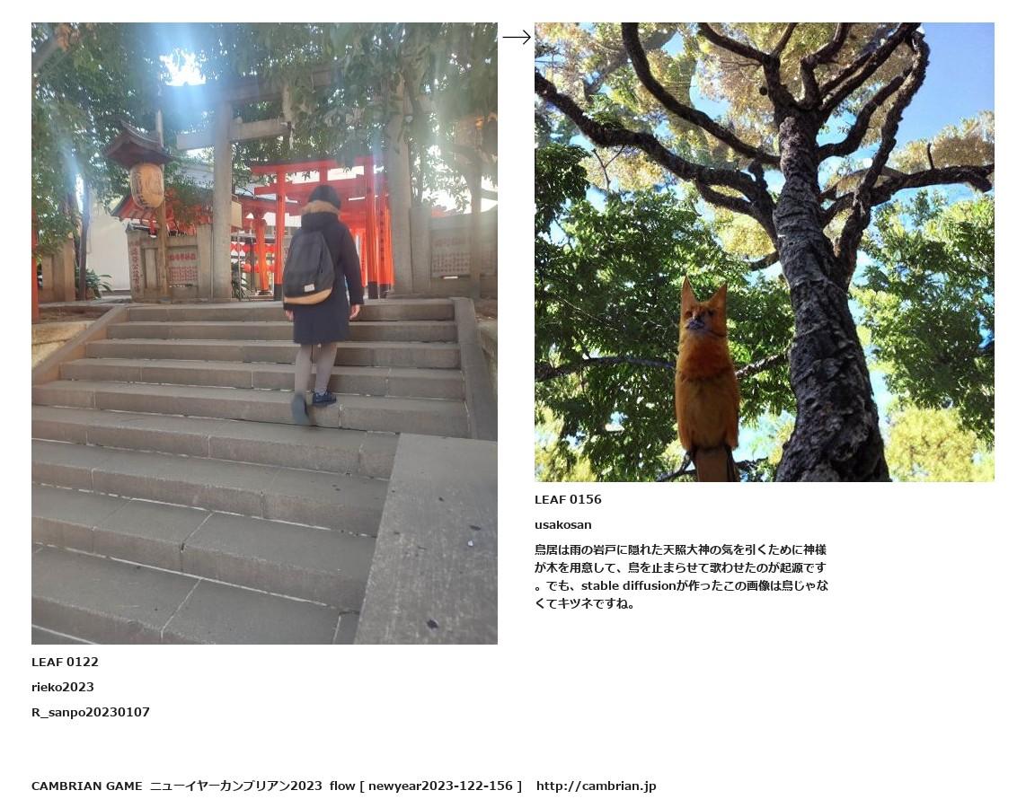 鳥居は雨の岩戸に隠れた天照大神の気を引くために神様が木を用意して、鳥を止まらせて歌わせたのが起源です。でも、stable diffusionが作ったこの画像は鳥じゃなくてキツネですね。