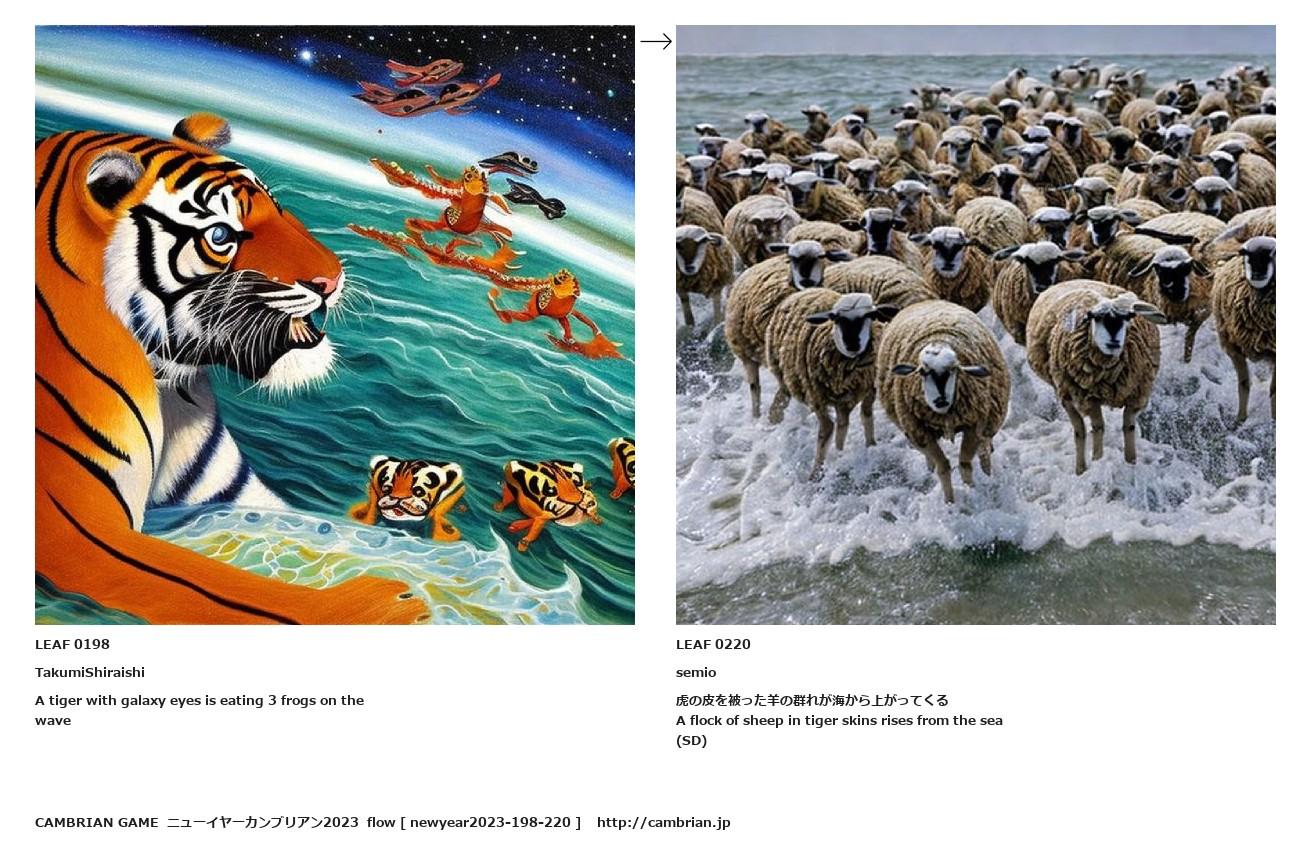 A flock of sheep in tiger skins rises from the sea