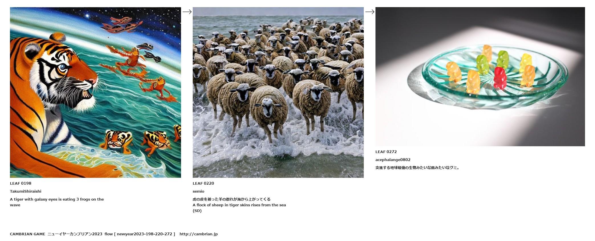 A flock of sheep in tiger skins rises from the sea