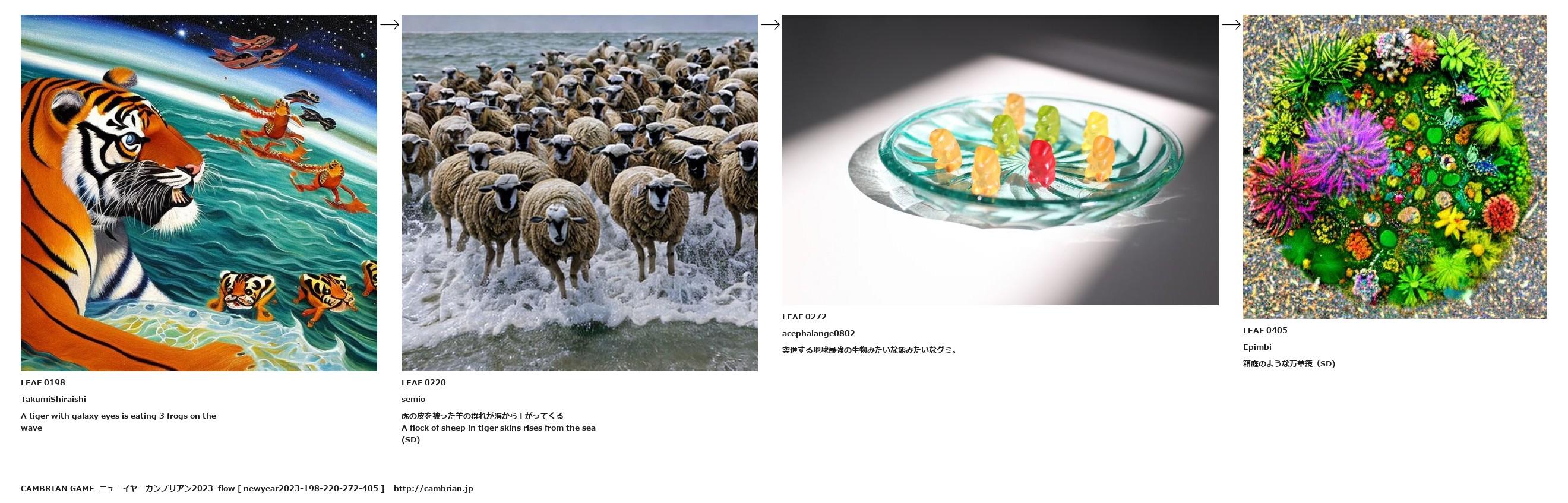 A flock of sheep in tiger skins rises from the sea