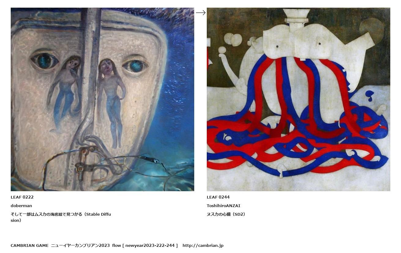 LEAF 0183フローに加えるLEAF 0222dobermanそして一部はムスカの海底絵で見つかる(Stable Diffusion)↑ここから上をフローから外す↓ここから下をフローから外すLEAF 0244ToshihiroANZAIヌスカの心臓(SD2)LEAF 0390フローに加える