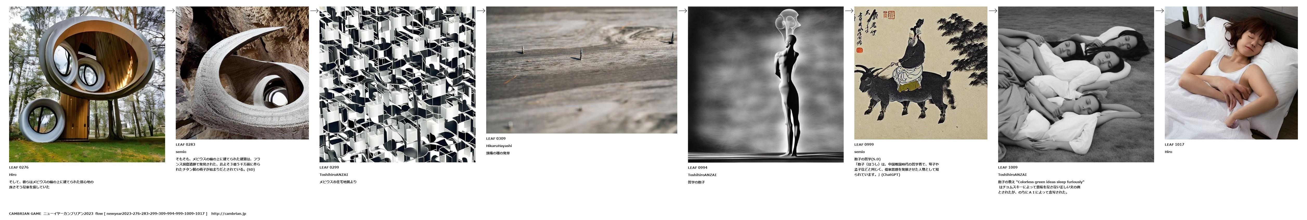 胞子の教え "Colorless green ideas sleep furiously" はチョムスキーによって意味をなさない正しい文の例とされたが、のちにAIによって念写された。
