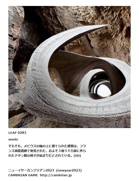 LEAF 0276フローに加えるLEAF 0283semioそもそも、メビウスの輪の上に建てられた建築は、フランス洞窟遺跡で発見された、およそ3億5千万前に作られたチタン製の椅子が始まりだとされている。(SD)LEAF 0299フローに加える