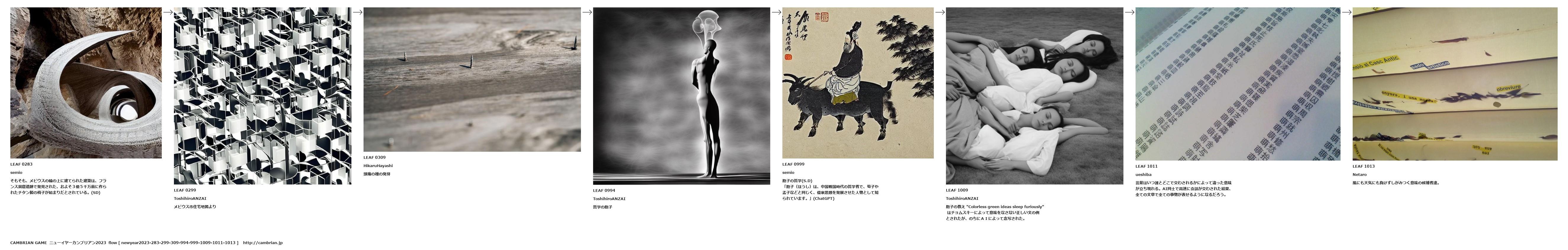 胞子の教え "Colorless green ideas sleep furiously" はチョムスキーによって意味をなさない正しい文の例とされたが、のちにAIによって念写された。