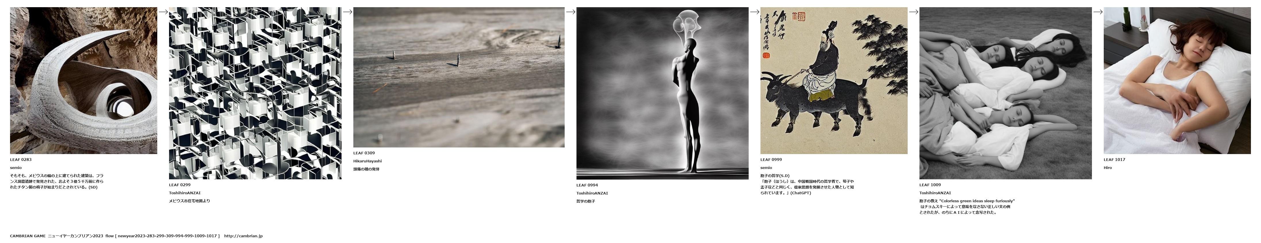 胞子の教え "Colorless green ideas sleep furiously" はチョムスキーによって意味をなさない正しい文の例とされたが、のちにAIによって念写された。