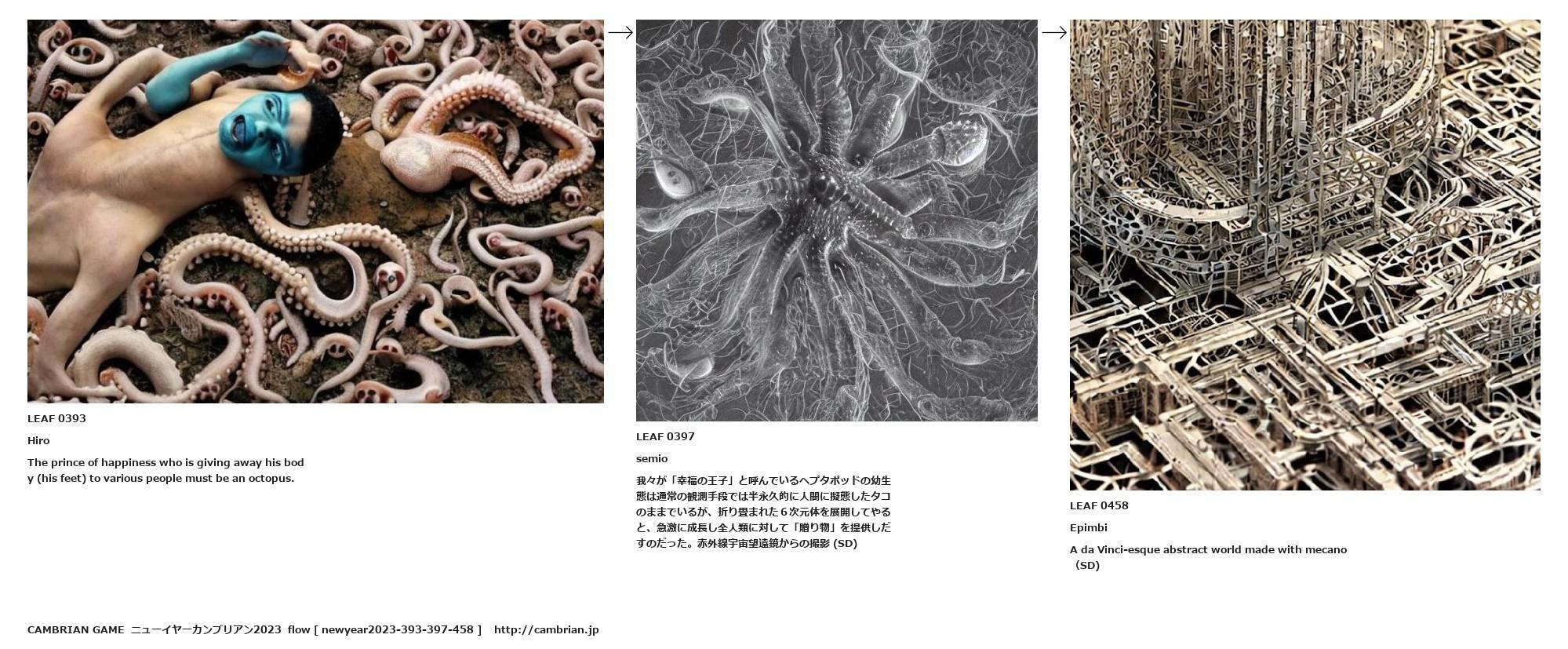 我々が「幸福の王子」と呼んでいるヘプタポッドの幼生態は通常の観測手段では半永久的に人間に擬態したタコのままでいるが、折り畳まれた6次元体を展開してやると、急激に成長し全人類に対して「贈り物」を提供しだすのだった。赤外線宇宙望遠鏡からの撮影 (SD)