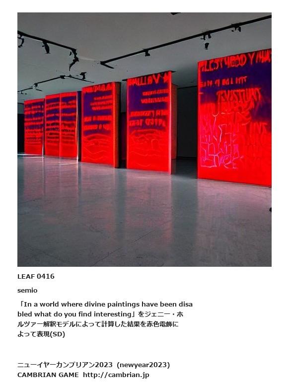 LEAF 0392フローに加えるLEAF 0416semio「In a world where divine paintings have been disabled what do you find interesting」をジェニー・ホルツァー解釈モデルによって計算した結果を赤色電飾によって表現(SD)