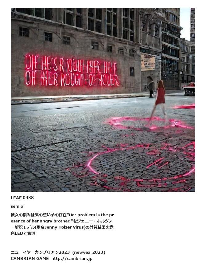 LEAF 0375フローに加えるLEAF 0438semio彼女の悩みは気の荒い弟の存在"Her problem is the presence of her angry brother."をジェニー・ホルツァー解釈モデル(別名Jenny Holzer Virus)の計算結果を赤色LEDで表現LEAF 0504フローに加える