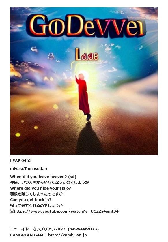 LEAF 0440フローに加えるLEAF 0453miyakoTamasudareWhen did you leave heaven? (sd)神様、いつ天国からいなくなったのでしょうかWhere did you hide your Halo?羽根を隠してしまったのですかCan you get back in?帰って来てくれるのでしょうか https://www.youtube.com/watch?v=UCZZs4smt34