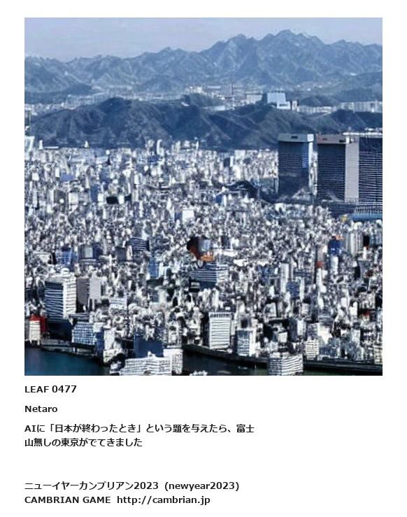 LEAF 0477NetaroAIに「日本が終わったとき」という題を与えたら、富士山無しの東京がでてきました