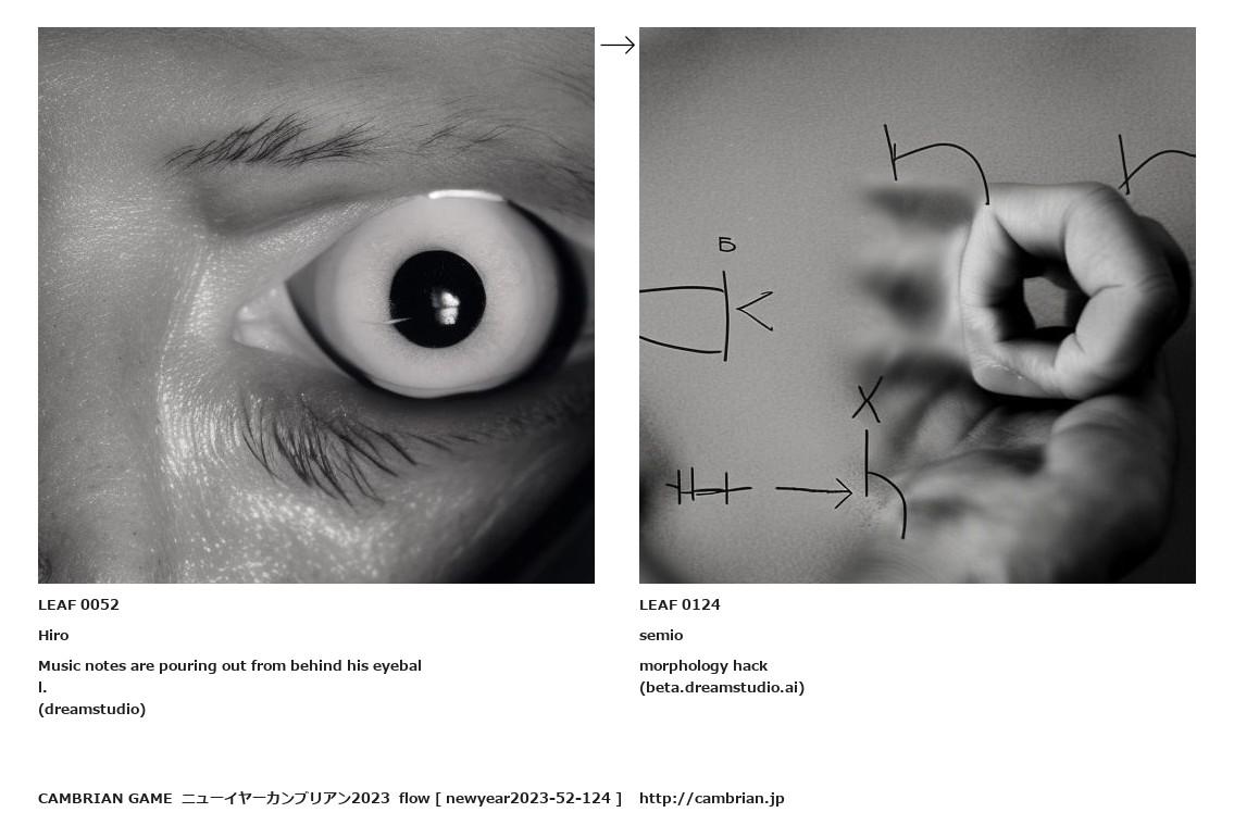 Music notes are pouring out from behind his eyeball.