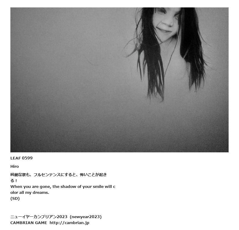 LEAF 0598フローに加えるLEAF 0599Hiro綺麗な歌も、フルセンテンスにすると、怖いことが起きる !When you are gone, the shadow of your smile will color all my dreams.(SD)LEAF 0649フローに加える