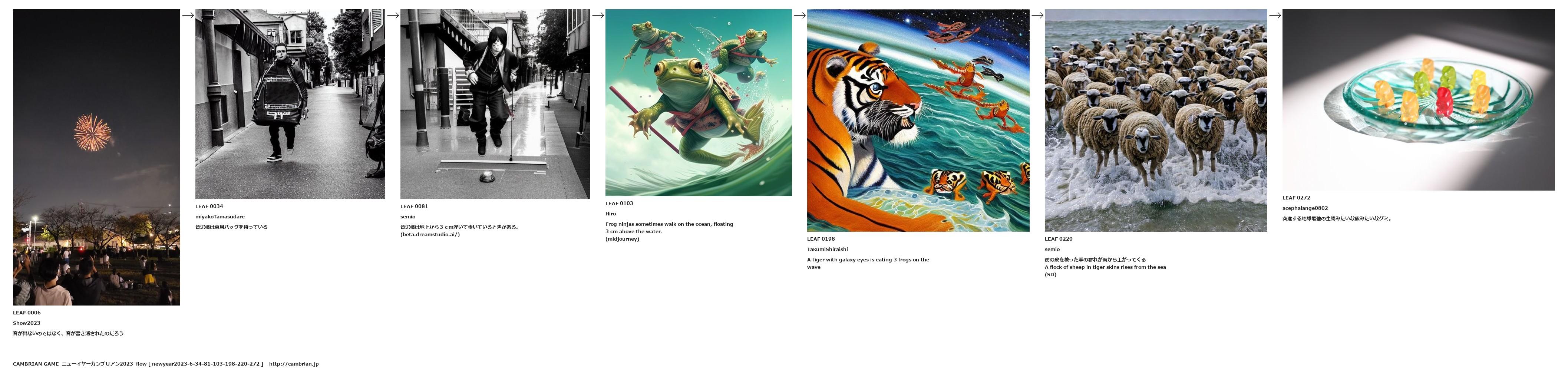 A flock of sheep in tiger skins rises from the sea
