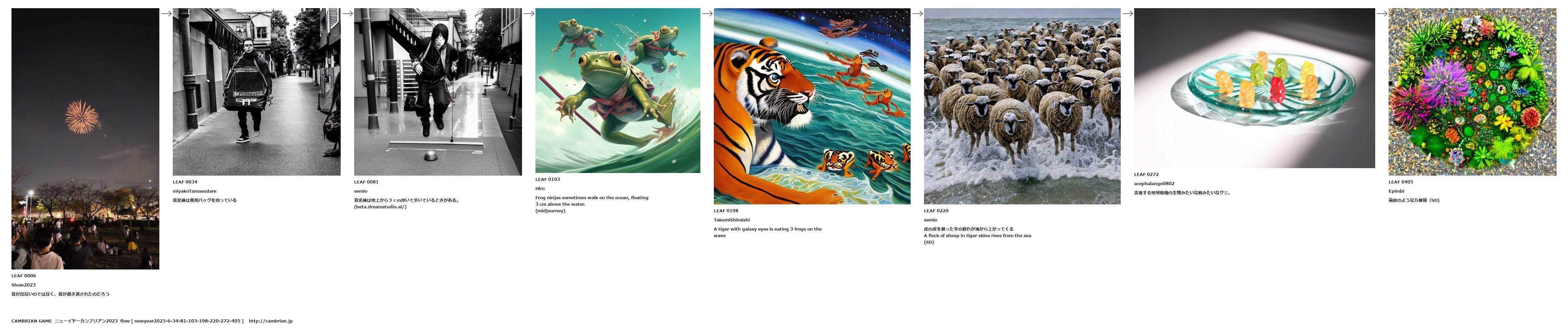A flock of sheep in tiger skins rises from the sea