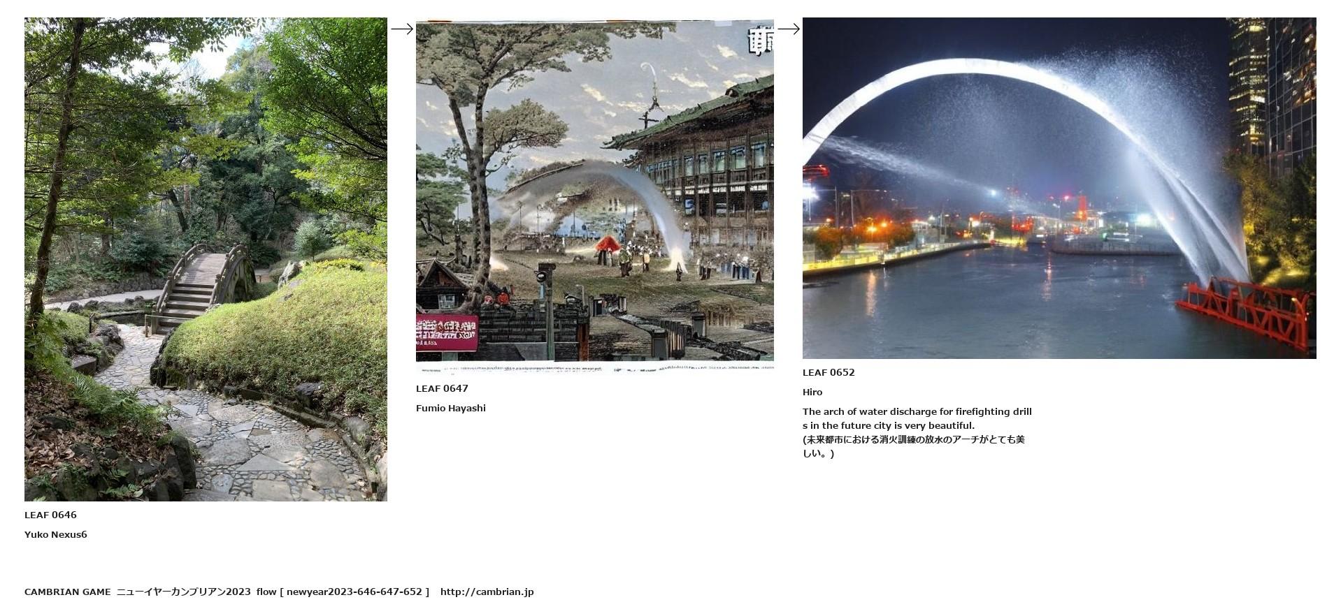 (未来都市における消火訓練の放水のアーチがとても美しい。)