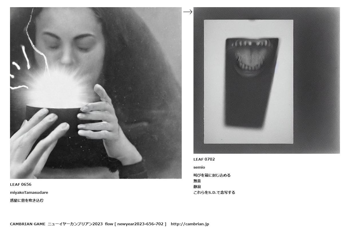 LEAF 0027フローに加えるLEAF 0656miyakoTamasudare惑星に息を吹き込む↑ここから上をフローから外す↓ここから下をフローから外すLEAF 0702semio叫びを箱に封じ込める無音静寂これらをS.D.で念写するLEAF 0703フローに加える