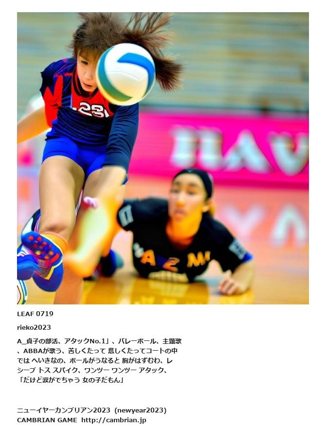 LEAF 0718フローに加えるLEAF 0719rieko2023A_貞子の部活、アタックNo.1」、バレーボール、主題歌、ABBAが歌う、苦しくたって 悲しくたってコートの中では へいきなの、ボールがうなると 胸がはずむわ、レシーブ トス スパイク、ワンツー ワンツー アタック、「だけど涙がでちゃう 女の子だもん」LEAF 0741フローに加えるLEAF 0738フローに加える
