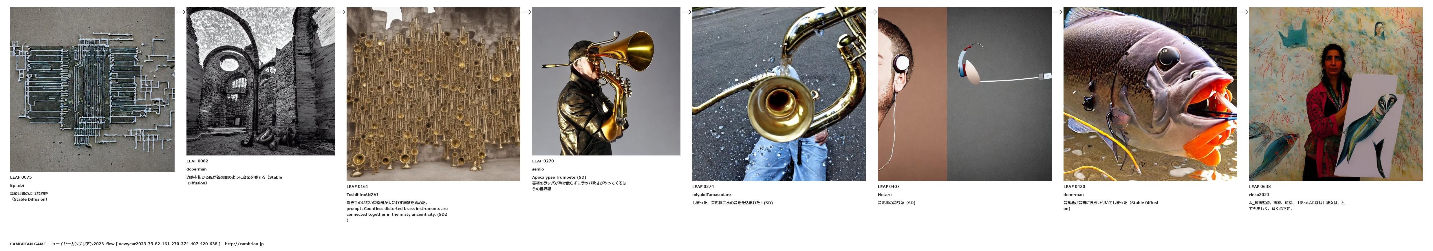 prompt: Countless distorted brass instruments are connected together in the misty ancient city. (SD2)