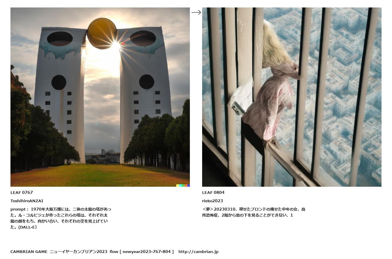 prompt: 1970年大阪万博には、二体の太陽の塔があった。ル・コルビジェが作ったこれらの塔は、それぞれ太陽の顔をもち、向かい合い、それぞれの空を見上げていた。(DALL-E)