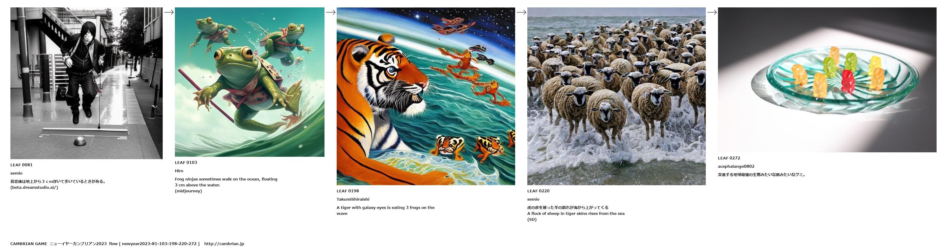 A flock of sheep in tiger skins rises from the sea