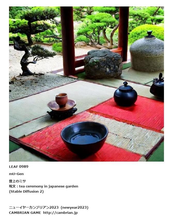 LEAF 0934フローに加えるLEAF 0989mU・Gen畳上のミサ呪文:tea ceremony in japanese garden(Stable Diffusion 2)LEAF 0990フローに加える