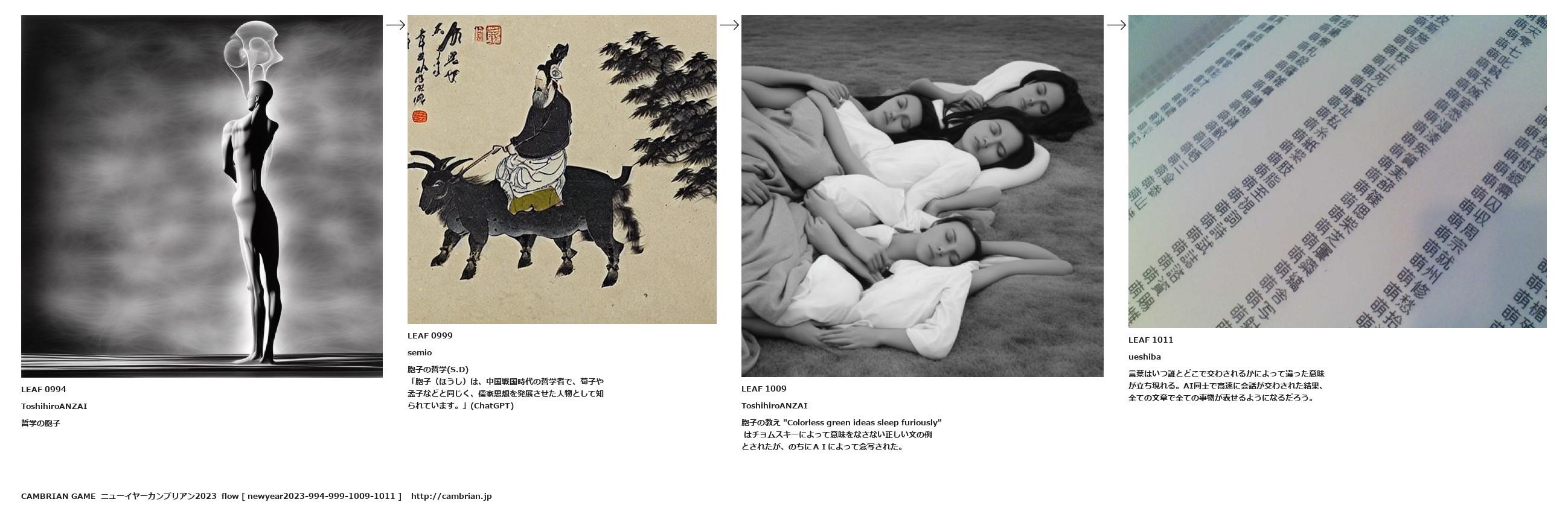 胞子の教え "Colorless green ideas sleep furiously" はチョムスキーによって意味をなさない正しい文の例とされたが、のちにAIによって念写された。