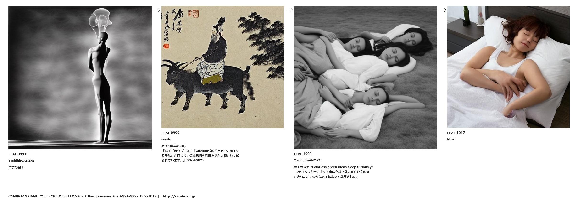 胞子の教え "Colorless green ideas sleep furiously" はチョムスキーによって意味をなさない正しい文の例とされたが、のちにAIによって念写された。